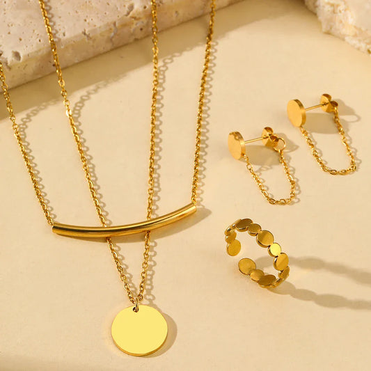 Złoto 18K pozłacany luksusowy zestaw: podwójne warstwy naszyjnik, kolczyki i pierścionek